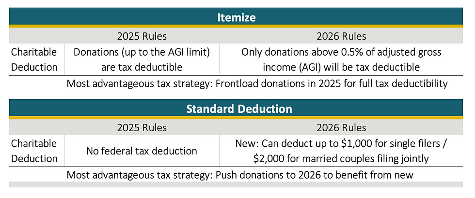 In 2026 charitable giving deduction rules will be changing, and the impact depends on whether you take the standard deduction or itemize: